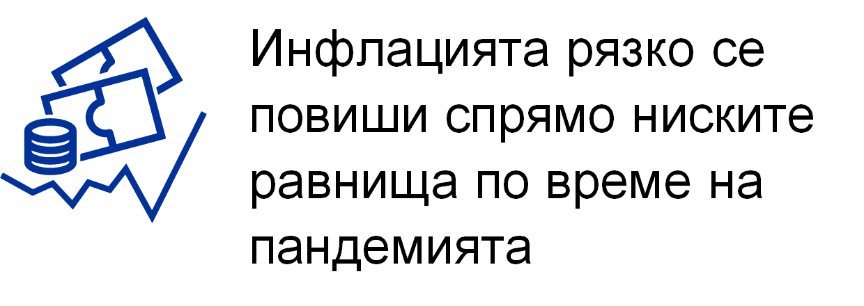 През 2021 г. инфлацията в световен мащаб значително се увеличи по отношение както на общата инфлация, така и на нейните измерители, като например тези, без храните и енергийните стоки (виж графика 1.3). В страните от Организацията за икономическо сътрудничество и развитие (ОИСР) общата инфлация нарасна до 6,6%, а инфлацията, без енергийните стоки и храните – до 4,6%. В повечето държави нарастването на инфлацията се дължеше главно на по-високите цени на енергийните и на други борсови стоки поради свързаните с пандемията несъответствия между ограниченото предлагане и бързо възстановяващото се търсене. В САЩ, където през второто тримесечие на 2021 г. реалният БВП достигна предкризисното си равнище, инфлационният натиск се засили значително и към края на годината се разшири. Инфлационният натиск стана по-широкообхватен и в някои икономики с нововъзникващи пазари.