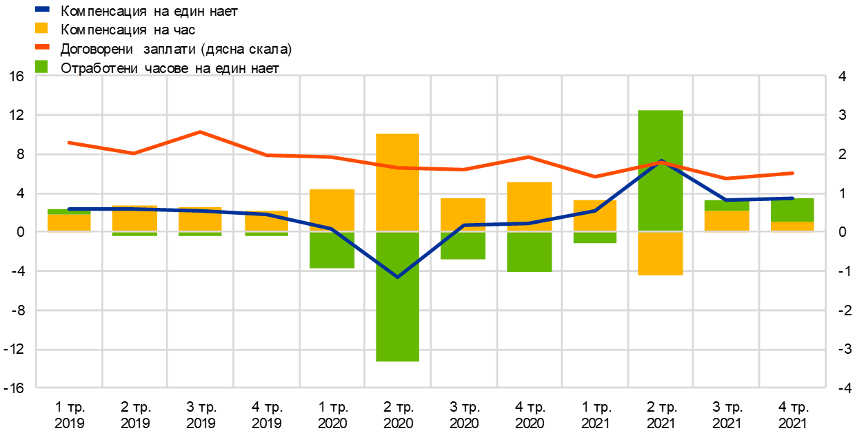По-високите равнища на свободните работни места, които първоначално се ограничаваха главно до секторите, отворили отново врати след отмяната на ограничителните мерки, с напредващото възстановяване на активността се разпространиха и в други сектори. През второто и третото тримесечие на 2021 г. темпът на растеж на заетостта се засили и въпреки някои пречки поради затруднения в доставките за преработващата промишленост през четвъртото тримесечие остана значителен и широкообхватен. В резултат на това заетостта в промишлеността, строителството и в секторите на услугите, изискващи по-малко контакти, се доближи до предпандемичните равнища. Заетостта в секторите с по-преки контакти остана сравнително ниска спрямо тази преди пандемията.