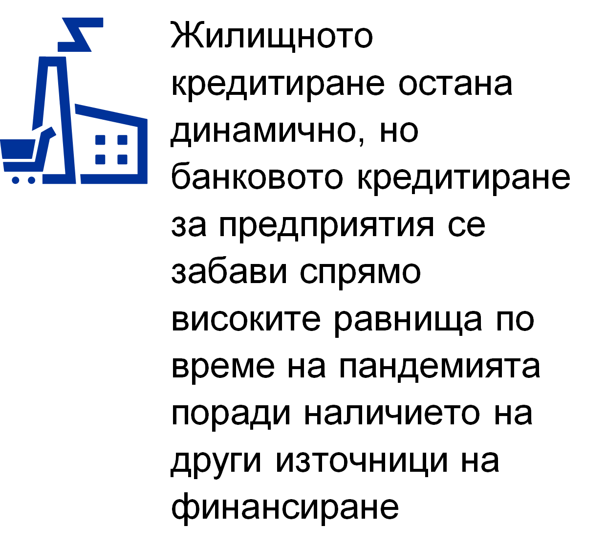 Със смекчаването на ограничителните мерки, свързани с пандемията, и с отварянето на икономиката стопанските инвестиции (приблизително равни на инвестициите извън строителството) набраха инерция през първата половина на 2021 г. в условията на запазващи се благоприятни условия за финансиране. Въпреки това затрудненията в предлагането, проявяващи се в увеличаващото се време за доставка и в цените на факторите на производство, повлияха неблагоприятно на възстановяването от средата на годината нататък, като ограничаваха стопанските инвестиции. Впоследствие рязкото покачване на цените на енергийните стоки и новата пандемична вълна в края на годината оказаха допълнително натиск върху стопанските инвестиции. В края на 2021 г. те отново набраха инерция, но останаха значително под равнището си от последното тримесечие на 2019 г. (виж графика 1.5). За разлика от тях още преди четвъртото тримесечие на 2020 г. инвестициите в сгради (или жилища) бяха надхвърлили предкризисното си равнище. През следващите тримесечия недостигът на материали и работници се отрази отрицателно върху рентабилността в строителството. Независимо от това благоприятните условия за финансиране и мерките за подпомагане на доходите, както и значителният обем натрупани спестявания поддържаха търсенето на жилища. В края на 2021 г. жилищните инвестиции надхвърлиха значително предкризисното си равнище.