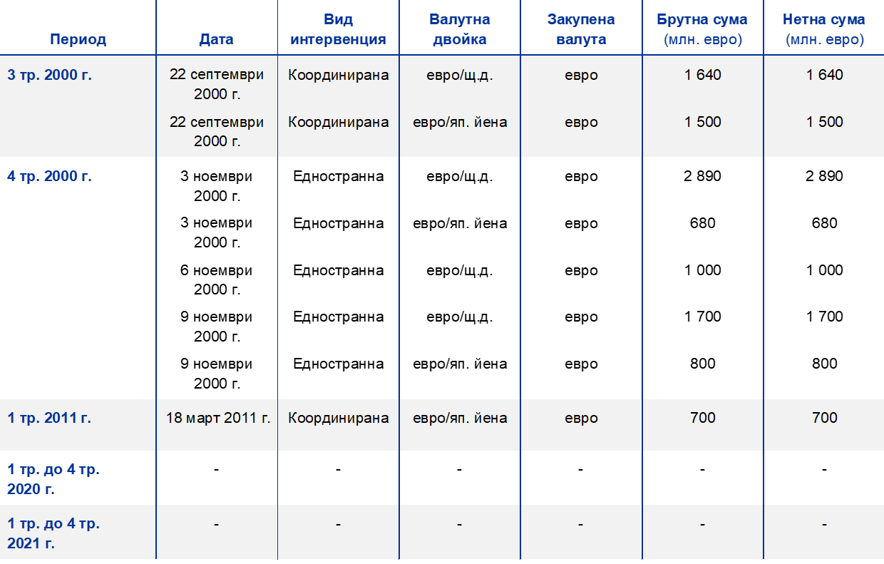 През 2021 г. еврото поевтиня с 3,6% в номинално ефективно изражение. При двустранните курсове това се дължеше главно на поевтиняването му със 7,7% спрямо щатския долар, което отразяваше най-вече разнопосочните тенденции в позицията по паричната политика на САЩ и еврозоната. Еврото поевтиня и спрямо британската лира, но поскъпна спрямо японската йена.