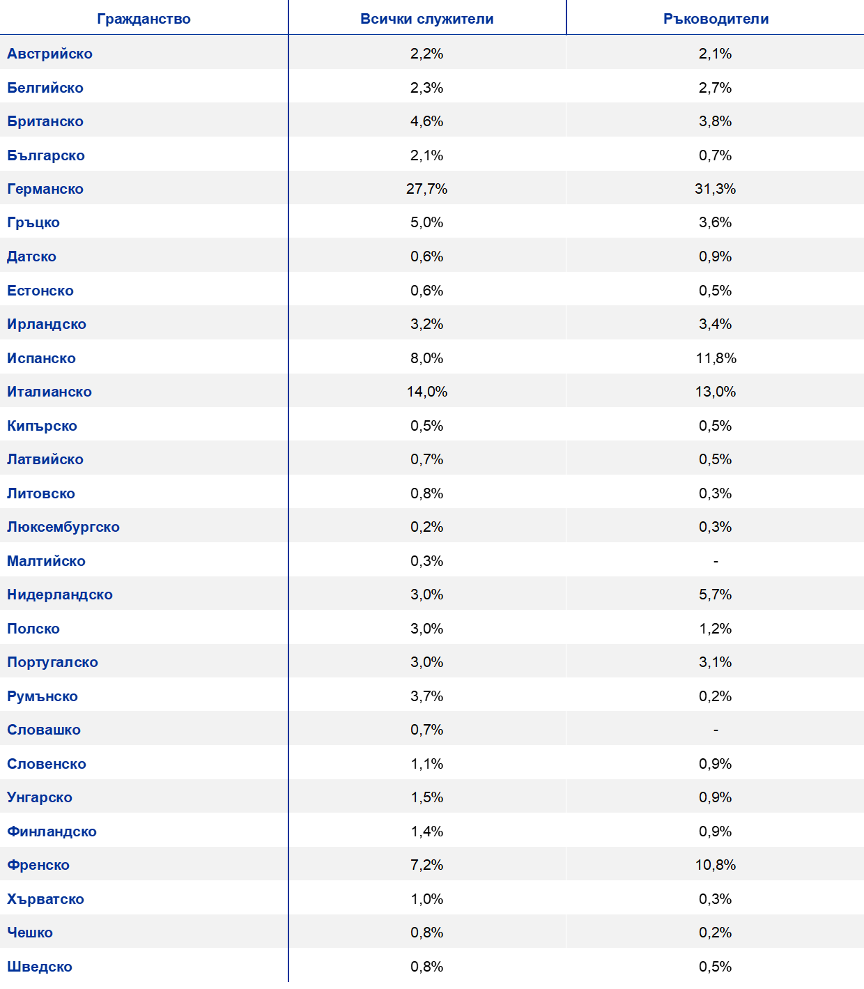 Числата са на база декларираното от служителите гражданство. ЕЦБ изисква от служителите да докладват поне едно гражданство от ЕС, като за целите на определянето на обезщетения е задължително обявяването на германско гражданство.