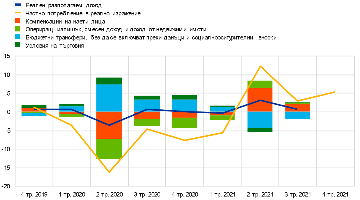 Забележка: Последните наблюдения са за третото тримесечие на 2021 г. за разполагаемия доход и съответния принос и за четвъртото тримесечие на 2021 г. за частното потребление.