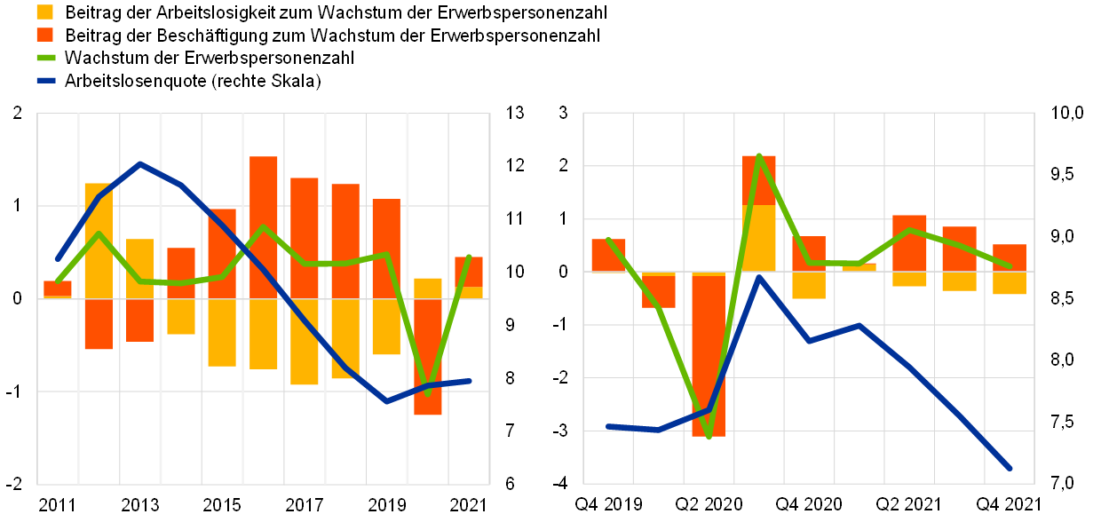Im Jahr 2021 stabilisierte sich die wirtschaftliche Erholung im Euroraum nach der pandemischen Notlage. Die Konjunktur gewann kräftig an Fahrt, und das reale BIP stieg um 5,3 %. Das Wachstum schwächte sich am Jahresende allerdings ab, als die Omikron-Welle der Covid-19-Pandemie erneut Einschränkungen notwendig machte. Bei der Beschäftigung war der Aufschwung ebenfalls zu spüren: Die Arbeitslosenquote sank zum Jahresende auf ein Rekordtief.