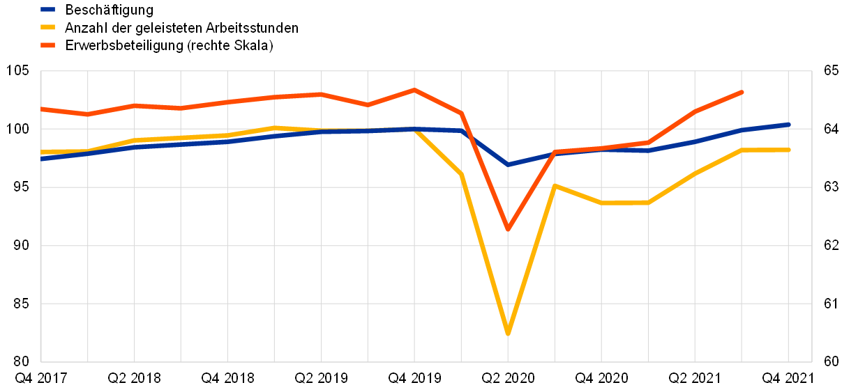 Anmerkung: Die jüngsten Angaben beziehen sich auf das vierte Quartal 2021 (Beschäftigung und geleistete Arbeitsstunden) bzw. das dritte Quartal 2021 (Erwerbsbeteiligung).