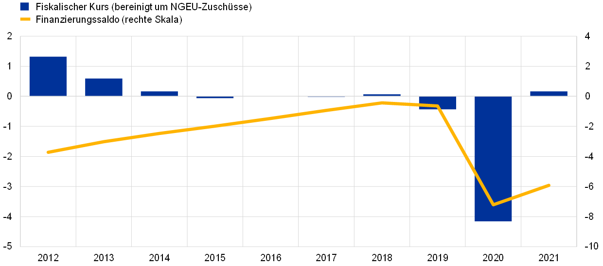 Anmerkung: Die Messgröße für den fiskalischen Kurs berücksichtigt Ausgaben, die über die Aufbau- und Resilienzfazilität des NGEU und andere EU-Strukturfonds finanziert werden (siehe Fußnote 5).