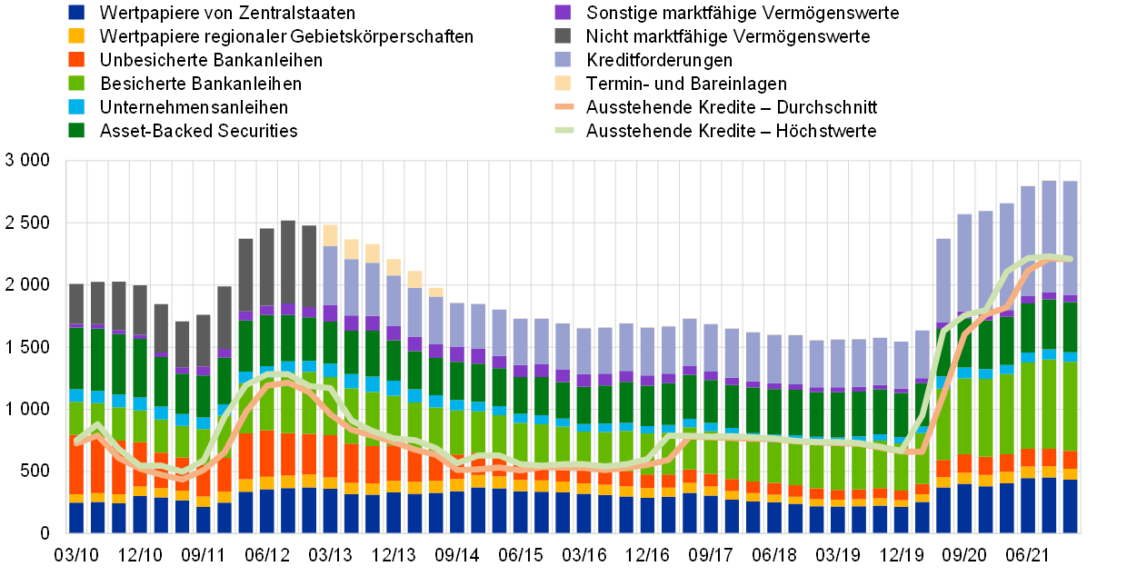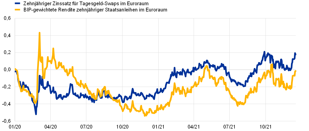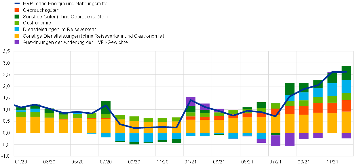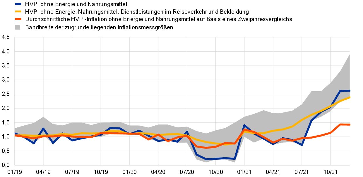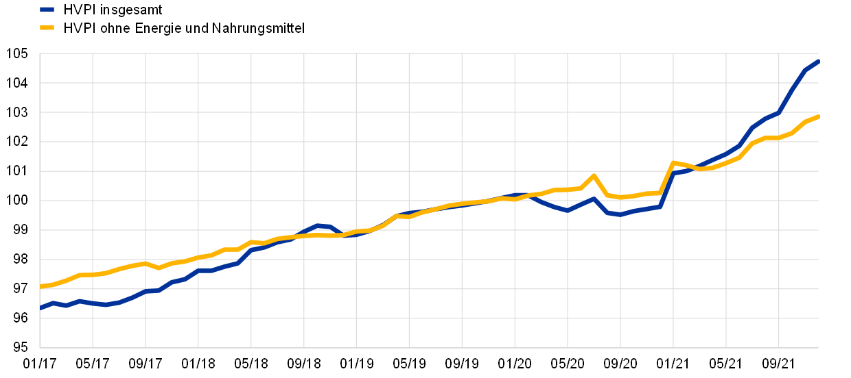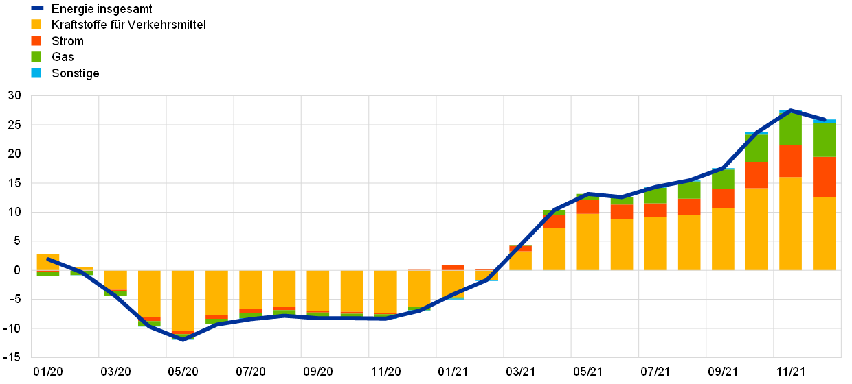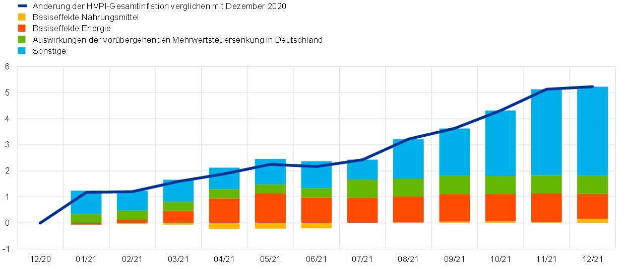 Mit dem raschen Hochfahren der Wirtschaft machten sich aber auch deutliche Spannungen bemerkbar. Während die Inflation im Euroraum zu Jahresbeginn noch auf einem sehr niedrigen Niveau gelegen hatte, ließen pandemiebedingte Lieferengpässe, die sich belebende weltweite Nachfrage und stark steigende Energiepreise die Inflationsrate in die Höhe schnellen. Die jährliche Gesamtinflation lag 2021 bei durchschnittlich 2,6 % nach nur 0,3 % im Vorjahr.
