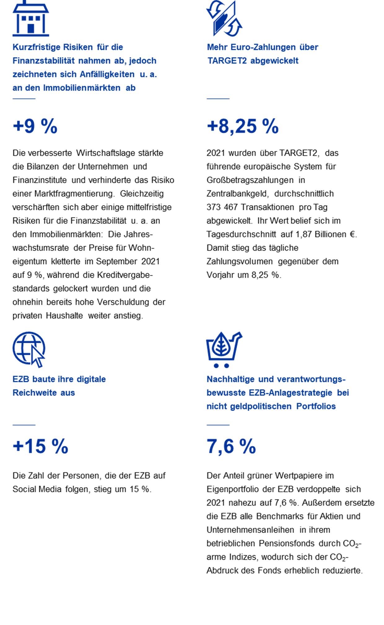 ** Dieser Überblick behandelt die Aktivitäten der Europäischen Zentralbank (EZB) im Jahr 2021. Er wurde vor der russischen Invasion in die Ukraine fertiggestellt. Die EZB ist bereit, alle notwendigen Maßnahmen zum Schutz der Finanzstabilität und zur Erfüllung ihres Mandats, der Gewährleistung von Preisstabilität, zu ergreifen.**
