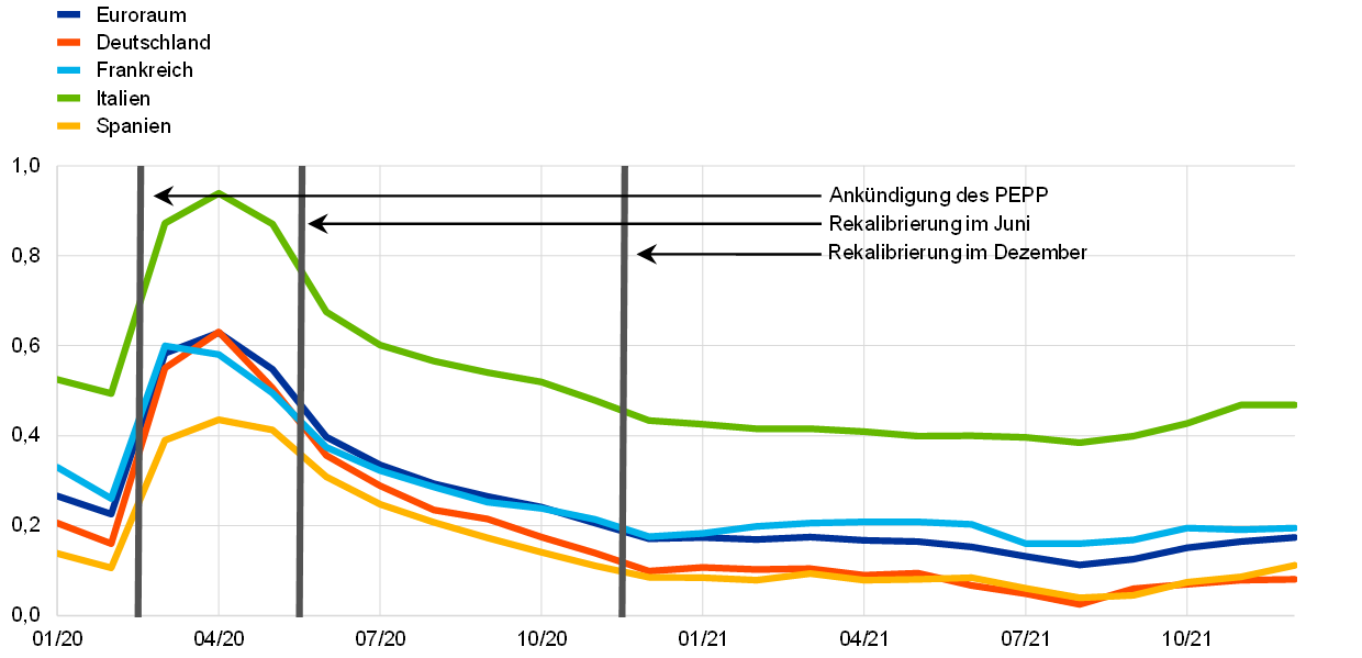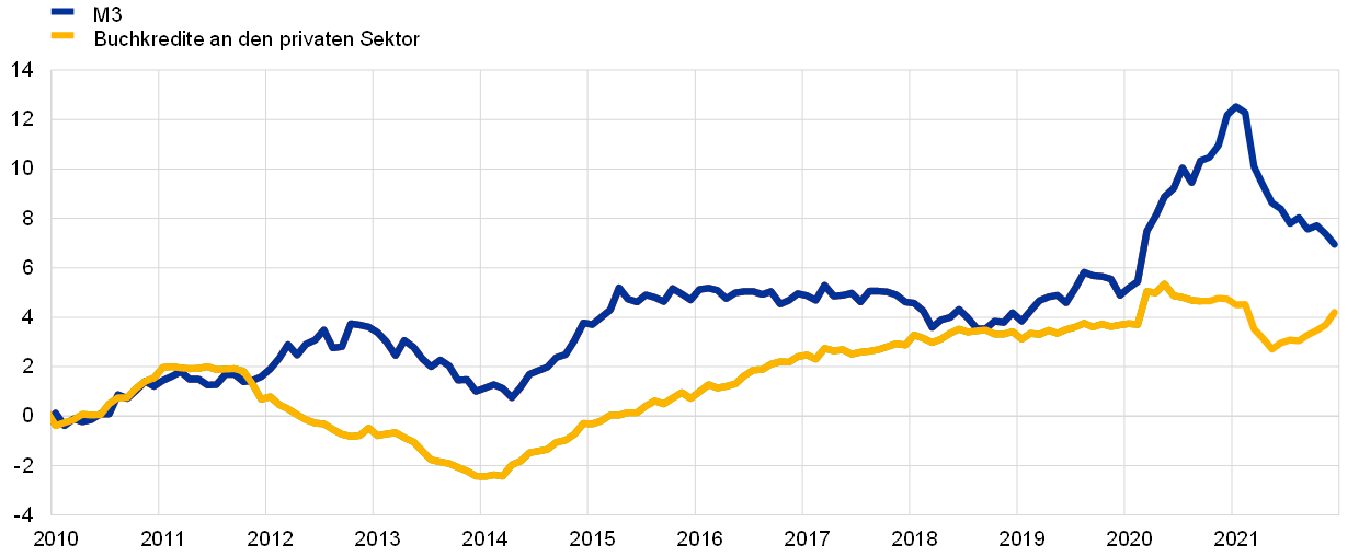 Im Dezember gelangte der EZB-Rat zu der Einschätzung, dass es die fortschreitende Konjunkturerholung und die Annäherung an unser mittelfristiges Inflationsziel zulassen, die Ankäufe von Vermögenswerten in den folgenden Quartalen schrittweise zu verringern. Er kündigte an, dass die Nettoankäufe im Rahmen des PEPP im März 2022 enden und seine übrigen Programme zum Ankauf von Vermögenswerten allmählich zurückgefahren werden.