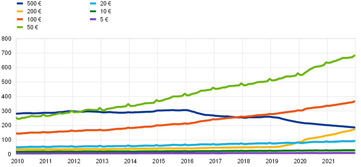 Die Unterstützung für den Euro ist groß. 79 % der Befragten im Euroraum, die im Juni-Juli 2021 an der Eurobarometer-Umfrage teilnahmen, stehen der gemeinsamen Währung positiv gegenüber. Der Euro muss aber auch für das digitale Zeitalter gerüstet sein. Darum hat der EZB-Rat die 24-monatige Untersuchungsphase eines Projekts zu einem digitalen Euro gestartet. Dessen ungeachtet wird Bargeld im Leben der Menschen weiterhin eine wichtige Rolle spielen. Im Dezember gab die EZB ihre Pläne bekannt, die zukünftigen Euro-Banknoten unter Einbeziehung von Input seitens interessierter Bürgerinnen und Bürger neu zu gestalten. Das endgültige Design soll im Jahr 2024 ausgewählt werden.