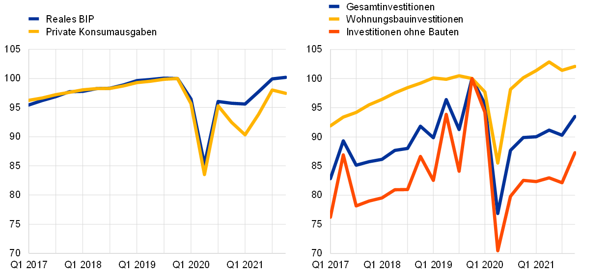 In der ersten Jahreshälfte gewannen die Unternehmensinvestitionen (näherungsweise beziffert anhand der Investitionen außerhalb des Baugewerbes) an Dynamik. Dies hing mit der Lockerung der Pandemiemaßnahmen und dem Wiederhochfahren der Wirtschaft sowie mit den nach wie vor günstigen Finanzierungsbedingungen zusammen. Allerdings belasteten angebotsseitige Engpässe, die sich in längeren Lieferzeiten und steigenden Vorleistungspreisen äußerten, die wirtschaftliche Erholung ab Mitte des Jahres und damit auch die Unternehmensinvestitionen. Die Investitionstätigkeit der Unternehmen wurde im weiteren Verlauf zusätzlich durch höhere Energiepreise und eine erneute Verschlimmerung der Pandemielage gegen Jahresende gebremst. Ende 2021 legten die Unternehmensinvestitionen wieder zu, blieben aber deutlich unterhalb ihres Standes vom vierten Quartal 2019 (siehe Abbildung 1.5). Demgegenüber hatten die Wohnungsbauinvestitionen bereits im vierten Quartal 2020 das Vorkrisenniveau überschritten. In den übrigen Jahresvierteln kam es aufgrund des Material- und Arbeitskräftemangels zu Rentabilitätsverlusten im Baugewerbe. Die Nachfrage nach Wohnimmobilien wurde jedoch von günstigen Finanzierungsbedingungen, Maßnahmen zur Stützung der Einkommen und den hohen akkumulierten Ersparnissen getragen. Zum Jahresende 2021 waren die Wohnungsbauinvestitionen deutlich höher als vor der Krise.