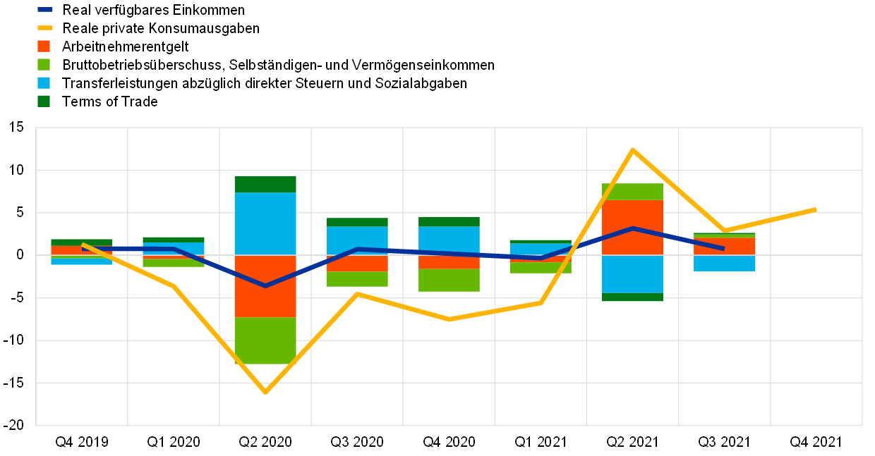 Anmerkung: Die jüngsten Angaben beziehen sich auf das dritte Quartal 2021 (verfügbares Einkommen und Beiträge) bzw. das vierte Quartal 2021 (Konsumausgaben).