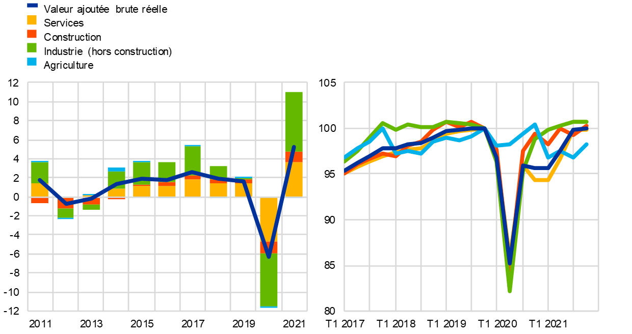 La croissance de la production est restée inégale selon les secteurs en 2021 (cf. graphique 1.7). Si l’industrie et les services ont apporté une contribution positive à la croissance, c’est cependant l’industrie qui a apporté la plus forte contribution à la hausse de la valeur ajoutée brute réelle.