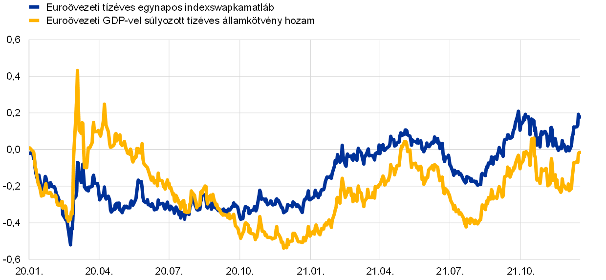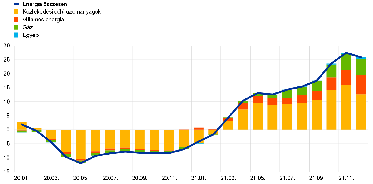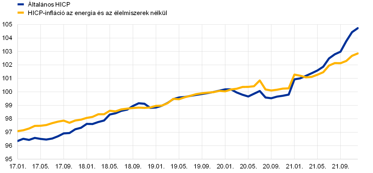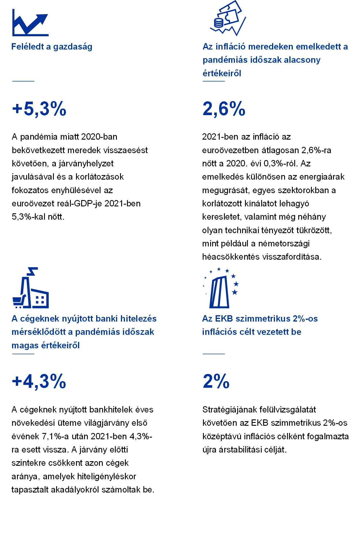 2021-ben a világgazdaságban erőteljes fellendülés volt tapasztalható, elsősorban a gazdaságok Covid19 elleni növekvő átoltottsági arányok közepette zajló újranyitásának, valamint a határozott és jól időzített szakpolitikai támogatásnak köszönhetően. Ugyanakkor a fellendülés valamennyire egyenetlen volt a fejlett és a feltörekvő piacgazdaságok körében. A globális infláció nőtt, ami főként az energiaárak meredek emelkedését tükrözte, valamint néhány szektorban a kínálatot meghaladó keresletet, a pandémiával kapcsolatos tényezőkből eredő ellenszél, továbbá egyéb kínálati és szállítási szűk keresztmetszetek mellett. Az előző évben tapasztalt addigi legnagyobb visszaesést követően 2021-ben az euroövezetben a reál-GDP-növekedés erőteljesen fellendült. E javuló munkaerőpiacokkal járó helyreállást megfelelően időzített és eltökélt monetáris, valamint fiskális politikai intézkedések támogatták. Mindazonáltal az év folyamán jelentős maradt a gazdasági bizonytalanság, továbbá markáns különbség volt a két legnagyobb szektor, az ipar és a szolgáltatások között. Az év elején a növekedést befolyásolták a lezárási intézkedések és az utazási korlátozások, amelyek negatív hatást gyakoroltak a szolgáltatások kínálatára és keresletére. Később, a globális kereslet kivételesen erőteljes fellendülését követően a kínálati oldali szűk keresztmetszetek kialakulása és a magasabb energiaköltségek korlátozták az ipari szektor termelését. 2021-ben a harmonizált fogyasztóiár-indexszel (HICP) mért euroövezeti infláció a 2020-as 0,3%-ról meredeken, 2,6%-ra nőtt. Az első néhány hónapban mérsékelt szinteken maradt, mielőtt az év folyamán megélénkült, és decemberben 5,0%-ot ért el. Az árak emelkedése nagy mértékben tükrözte az energiaárak meredek és széles körű megugrását, a kereslet és kínálat egyensúlyhiányait a gazdaságok újranyitását követően, továbbá technikaibb jellegű tényezőket, például a németországi átmeneti héacsökkentés visszafordítását. 2021-et követően, rövid távon magas inflációra számítottak, ami 2022 folyamán enyhül. Az Ukrajnában zajló orosz megszállás azonban jelentősen felerősítette az inflációs kilátásokat övező bizonytalanságot.