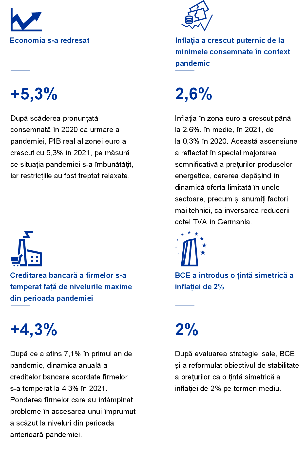 În 2021, economia mondială a consemnat o redresare puternică, în principal ca urmare a redeschiderii economiilor pe fondul creșterii ratelor de vaccinare împotriva COVID-19 și a sprijinului susținut și prompt din partea politicilor. Cu toate acestea, revigorarea a fost, într-o oarecare măsură, neuniformă între economiile dezvoltate și cele emergente. Inflația globală a crescut, reflectând în principal majorarea accentuată a prețurilor produselor energetice și expansiunea mai rapidă a cererii față de ritmul ofertei în unele sectoare, pe fondul dificultăților generate de pandemie și al altor blocaje pe partea ofertei și la nivelul transporturilor. În zona euro, dinamica PIB real s-a redresat puternic în 2021, după ce anul precedent înregistrase cea mai mare scădere din perspectivă istorică. Această revenire, care a dus la îmbunătățirea condițiilor pe piețele forței de muncă, a fost susținută de măsuri de politică monetară și fiscală prompte și ferme. Cu toate acestea, incertitudinea economică s-a menținut la un nivel ridicat în cursul anului, iar diferența dintre cele mai mari sectoare, industrie și servicii, a fost pronunțată. La începutul anului, creșterea a fost afectată de măsurile de izolare și de restricțiile de călătorie, care au avut un impact negativ asupra ofertei și cererii de servicii. Ulterior, ca urmare a revigorării deosebit de robuste a cererii globale, apariția unor blocaje pe partea ofertei și creșterea costurilor cu energia au redus producția în sectorul industrial. Inflația din zona euro, măsurată pe baza indicelui armonizat al prețurilor de consum (IAPC), a crescut brusc la 2,6% în 2021, de la 0,3% în 2020. Aceasta a rămas la niveluri scăzute în primele câteva luni, dar a urcat în cursul anului, atingând o rată de 5,0% în decembrie. Ascensiunea prețurilor a reflectat în mare măsură o creștere accentuată și generalizată a prețurilor produselor energetice, dezechilibrele între cerere și ofertă ca urmare a redeschiderii economiilor și o serie de factori mai tehnici, precum încetarea reducerii temporare a cotei TVA în Germania. După anul 2021, se preconiza că inflația se va menține ridicată pe termen scurt, dar va scădea în 2022. Totuși, invadarea Ucrainei de către Rusia a amplificat semnificativ incertitudinile asociate perspectivelor inflației.