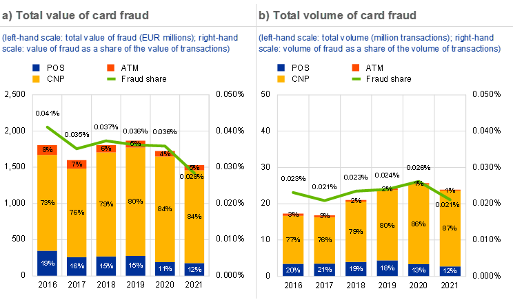 Card fraud in 2021 declined in terms of both card-present transactions (at Automated Teller Machines (ATMs) and Point-of-Sale (POS) terminals) and card-not-present (CNP) transactions (e.g. via the internet).