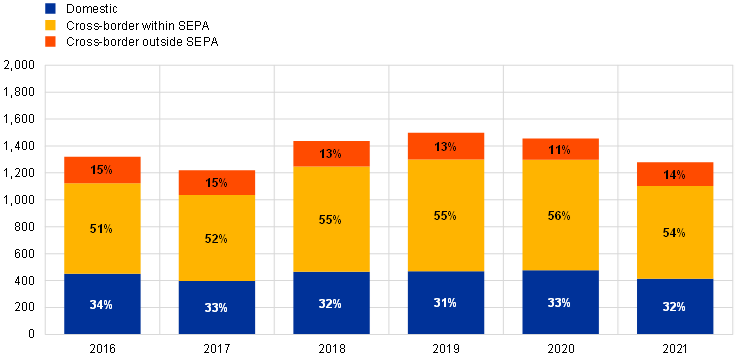 Turning to the geographical breakdown for card fraud, the total value of domestic and cross-border fraud for transactions acquired within SEPA declined by 9% and 16% respectively in 2021 (compared with a decline of around 4% in both cases in 2020). Meanwhile, the value of fraud for transactions acquired outside SEPA increased by 6% in 2021, following a decline of around 30% in 2020. However, this increase was more than outweighed by the aforementioned general uptake in cross-border payments acquired outside SEPA. Consequently, relative fraud shares declined across all geographical dimensions in 2021.
