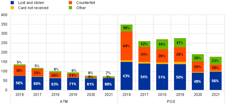 Losses from lost or stolen cards continued to be the main type of card-present fraud, accounting for 88% of all ATM and 56% of all POS fraud in 2021. Only a minor share of card fraud conducted at ATMs was due to other types of card-present fraud, while these continued to play a more significant role at POS terminals.[7]