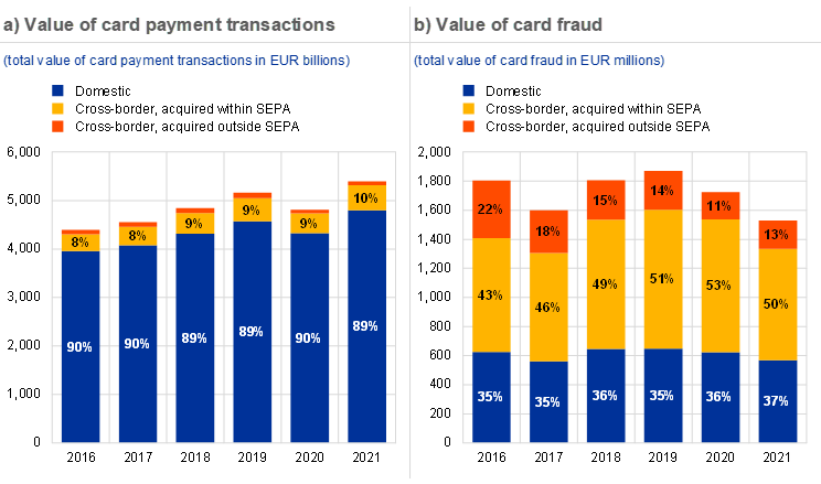 The total value of transactions using cards issued in SEPA amounted to €5.40 trillion in 2021, of which €1.53 billion (0.028%) was fraudulent (see Chart 1a).