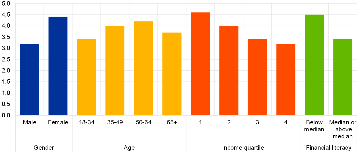 When reaching out to the wider public, the ECB needs to consider the diversity of those who are at the receiving end of central bank communication. Compared with other major central banks, the ECB stands out in terms of the linguistic diversity of its audience. It communicates in 24 languages to an audience made up of 340 million citizens, spread across 19 Member States. Besides language diversity, ECB communication also needs to account for different financial literacy levels across countries (Chart 1)[6] and the heterogeneity of inflation expectations among the wider public (Chart 2). Results from the ECB Consumer Expectations Survey (CES) indicate that inflation expectations are higher for female consumers than male consumers, increase with age and decrease with a high level of financial literacy and income.[7]