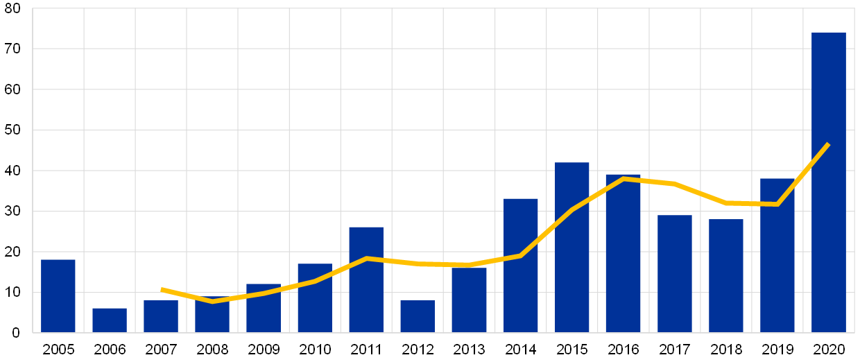 Notes: Number of interviews by ECB Executive Board members published on the ECB’s website. Three-year moving average is superimposed. No interviews dating before 2005 are published on the ECB’s website.