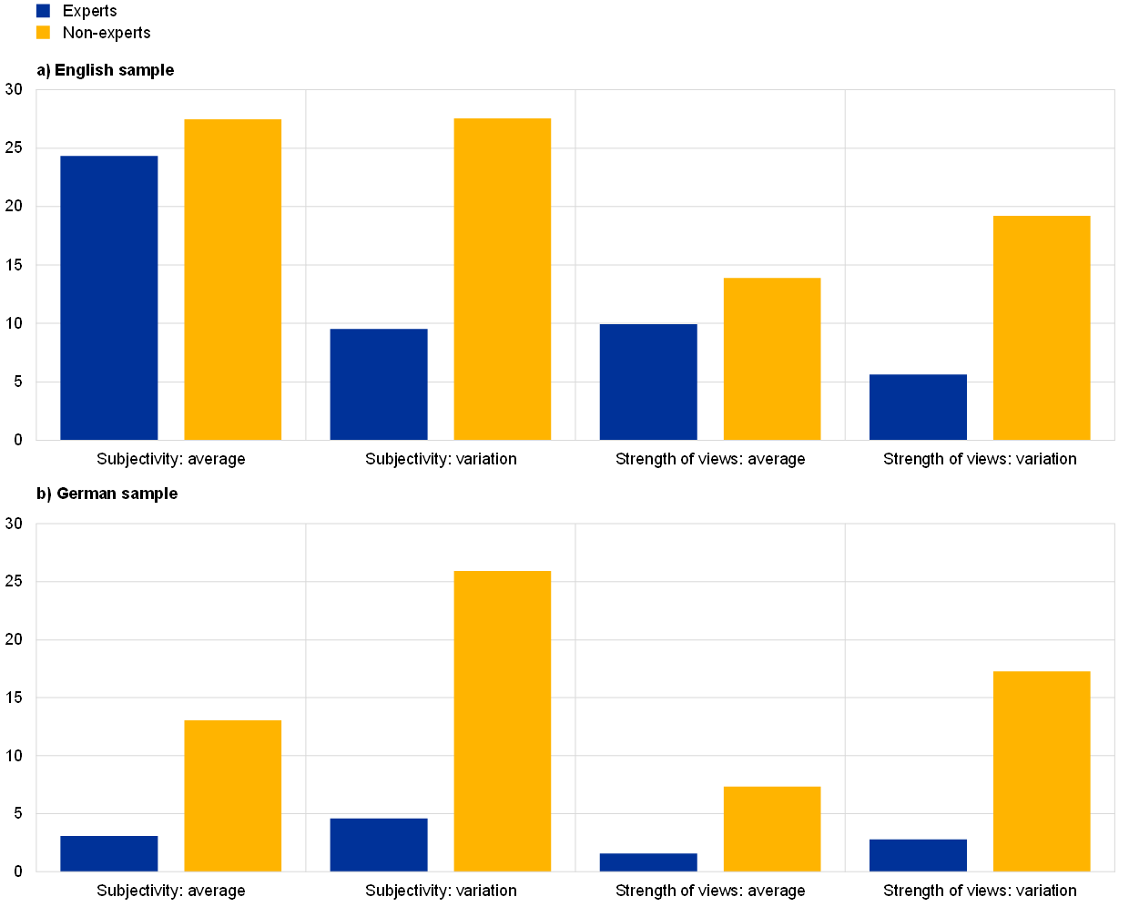 Notes: The chart shows summary statistics for tweets issued by experts and by non-experts, in English and German respectively. Subjectivity and strength of views are measured based on a dictionary approach, and are restricted to lie between 0 and 100. The English lexicon is based on Princeton University’s WordNet, the German lexicon on the German equivalent GermaNet. Being based on two different dictionaries, sentiment in English and German tweets is not directly comparable. Words that indicate subjectivity are, for instance, “terrible” or “actual”, which yield subjectivity values of 100 and 0, respectively. Indicators for the strength of views are, for instance, “awful”, “marvellous” or “consistent”, which yield values of 100, 100 and 0, respectively. For both sentiment measures, the chart plots i) the average across all ECB-related tweets and ii) the standard deviation of the account-specific average sentiment measure as a measure of variation. Based on data covering the years 2012-2018.