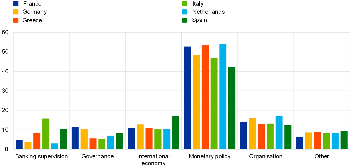 Notes: The sample includes ECB-related articles featured in the main media outlets of the selected countries for the period January 2019 to September 2021. The classification was performed manually by an external provider. The category “Governance” mostly captures media coverage of the ECB’s mandate and accountability, while the category “Organisation” includes coverage of the governing bodies of the ECB and staffing issues.