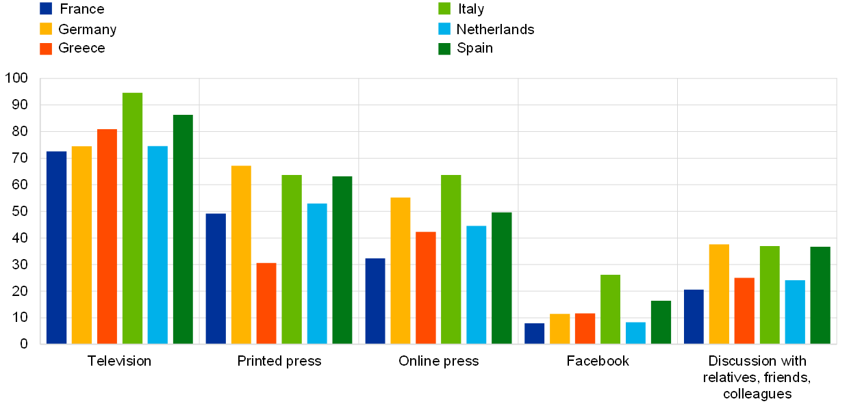 Notes: Respondents were asked the following question: “Where have you heard of the ECB?”. The chart shows the share of respondents who selected a given source at the national level for selected countries. Respondents were able to pick more than one answer.