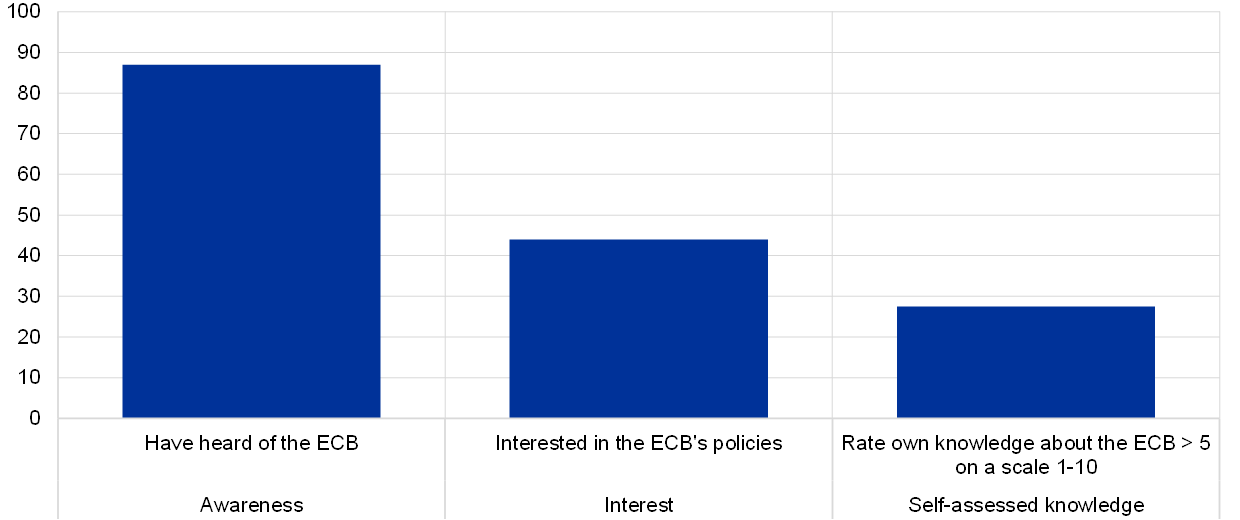 Notes: Respondents were asked the following questions: “Have you heard of the European Central Bank?” (Possible answers: Yes, No, Don’t know), “How interested are you in information about the European Central Bank and its policies?” (Possible answers: Very interested; Fairly interested; Not very interested; Not interested at all; Don’t know) and “On a scale from 1 to 10, where 1 means that you know nothing at all and 10 means that you know a great deal, how would you assess your knowledge of the policies of the European Central Bank?” (Possible answers include Don’t know). For the awareness question, the chart displays the share of “Yes” responses. For the interest question, the chart displays the share of “Very interested” and “Fairly interested” responses. For the self-assessed knowledge question, the chart displays the share of responses in the range 6-10.