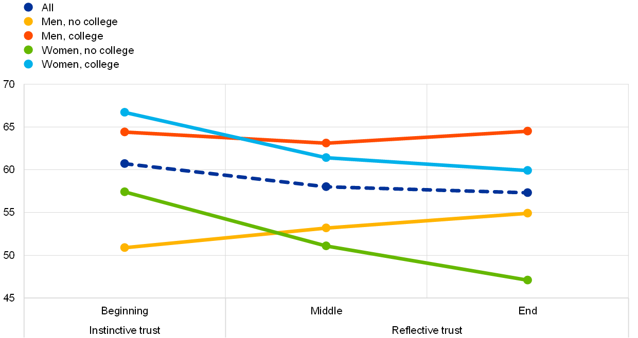 Given the importance of trust for central banks, it is essential to have a deeper understanding of how public trust can be built and sustained. In this context, important societal shifts with respect to how trust is generated and lost are of great relevance for the ECB.[25] However, there is ample literature that confirms that by communicating in an accessible manner[26] and by engaging with citizens[27], central banks can build knowledge, increase understanding and ultimately affect people’s trust in them. Two key mechanisms can be distinguished: “reflective trust”, which builds on greater understanding as a stepping stone towards increased trust; and “instinctive trust”, which builds more on emotion and personal experience and generates trust in the institution even in the absence of a clear understanding of its role or policy.[28]