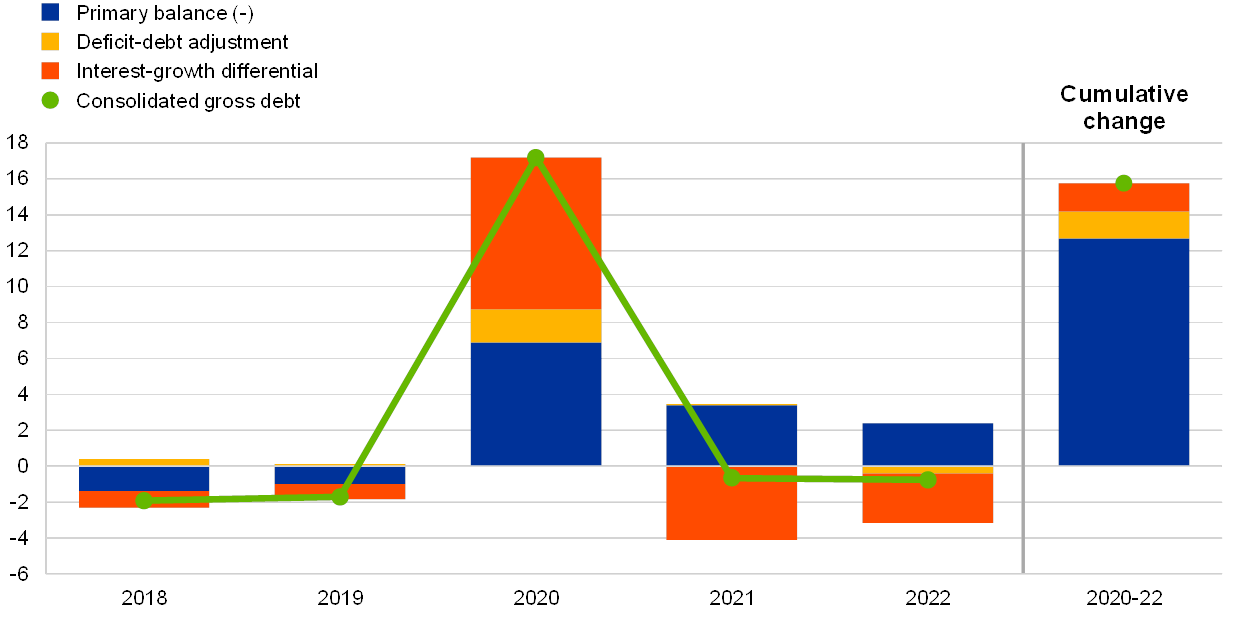 As a result of the COVID-19 pandemic, the euro area aggregate public debt-to-GDP ratio is projected to surge to 101.3% of GDP in 2020, before declining very gradually. The increase in 2020, of 17.2 percentage points compared with 2019, is due mainly to a combination of high primary deficits and a very adverse interest-growth differential, but also to a significant deficit-debt adjustment which largely reflects measures related to the pandemic. In 2021 and 2022 declining, albeit still significant primary deficits will be more than offset by favourable contributions from improving interest-growth differentials as economic activity is projected to recover (see Chart 27). As a result, the debt-to-GDP ratio is expected to stand very close to 100% at the end of 2022, an upward revision of 17.3 percentage points compared with the March 2020 projections.