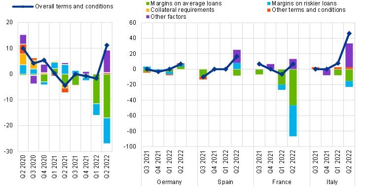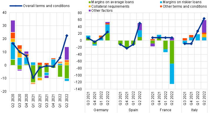 Credit standards for loans to enterprises tightened across all four largest euro area countries in the second quarter of 2022. Higher perceived risks and banks’ lower risk tolerance were the main driving factors in Spain, France and Italy. In addition, banks in Italy and France referred to an overall tightening impact from competition, which is related to lower competition from market financing, while French banks also referred to competition from non-banks as financial market conditions become less favourable. A tightening impact of cost of funds and balance sheet constraints was reported by banks in Italy, driven by higher capital costs, by banks’ ability to access market financing and, to a smaller extent, by their liquidity position.