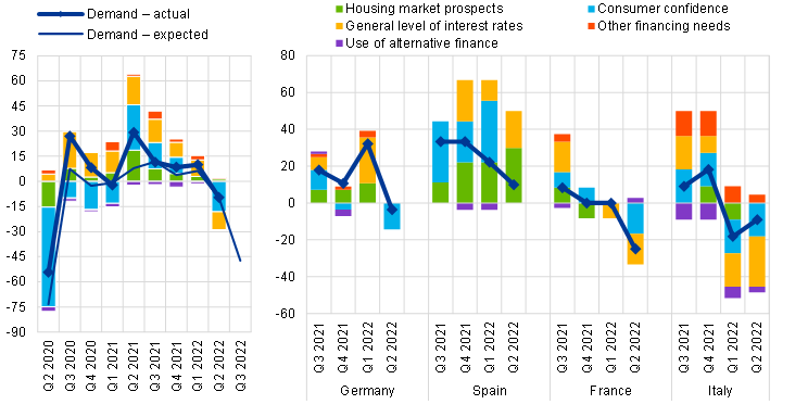 Across the largest euro area countries, banks in Germany, France and Italy recorded a net decrease in demand for housing loans, while banks in Spain reported a net increase in the second quarter of 2022. In Germany, lower consumer confidence drove the net decline, while in France and Italy banks reported that both consumer confidence and the general level of interest rates had a negative impact. Spanish banks attributed the reported increase to housing market conditions and the current interest rate environment, possibly related to frontloading effects.