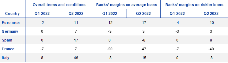 In the largest euro area countries, overall terms and conditions on loans or credit lines to enterprises tightened, on balance, in Germany, Spain and Italy, and remained unchanged in France in the second quarter of 2022. Across the four largest economies, banks mentioned higher risk perceptions as the main factor which contributed to tightening, while banks’ decreased risk tolerance had a tightening impact for overall terms and conditions in Germany, Spain and Italy. In addition, capital costs contributed to a tightening in Germany and Italy, while increased market financing costs contributed to a tightening of credit conditions across all four largest euro area countries. Banks in Germany and Italy also reported a tightening impact of their liquidity position on overall terms and conditions. Margins on both average and riskier loans to firms widened in Germany, Spain and Italy, while in France margins widened for riskier loans and narrowed for average loans.