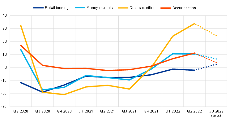 The July 2022 BLS also included a number of ad hoc questions. Euro area banks reported that their access to money markets, securitisation and particularly debt securities deteriorated, in net terms, in the second quarter of 2022, reflecting the tightening of financial market conditions for banks in the context of the ongoing monetary policy normalisation. By contrast, access to retail funding improved slightly in the second quarter of 2022. In the third quarter of 2022, banks expect a slight deterioration in access to retail funding, and a continued deterioration in access to market-based funding, in particular debt securities funding.