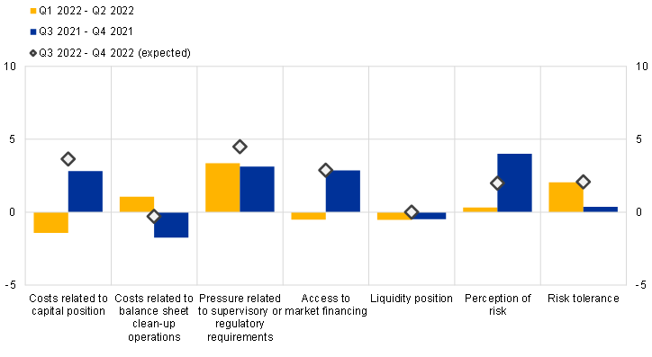 Banks cited increased perceptions of risk, costs related to their capital position, access to market financing, and pressure related to supervisory or regulatory requirements as contributing to a small net tightening impact of NPL ratios on lending conditions in the first half of 2022 (see Chart 15). At the same time, costs related to balance sheet clean-up had a slight easing impact while banks’ risk tolerance and liquidity positions had a neutral impact on lending conditions.
