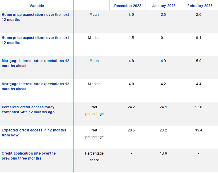 Notes: Weighted estimates. Net percentages are obtained by subtracting the percentage of respondents indicating that credit access has (will) become easier from the percentage of respondents indicating that credit access has (will) become more difficult. The median is computed on the basis of a symmetric linear interpolation that accounts for rounding of responses. Mean values are winsorised at the 2nd and 98th percentiles of each survey round and country. Numbers on home prices are reported in expected annual percentage changes.