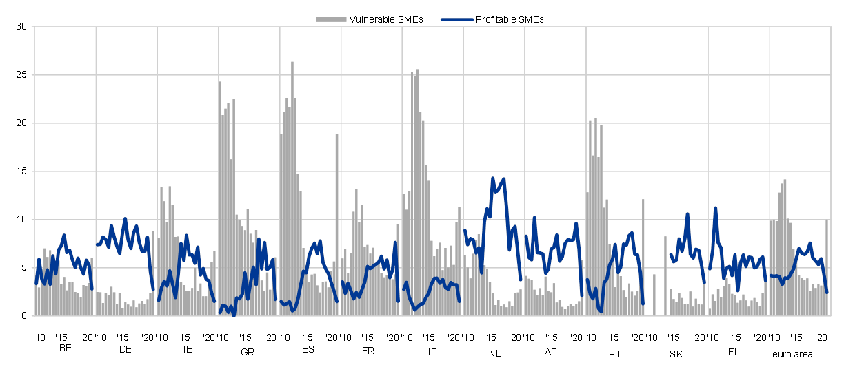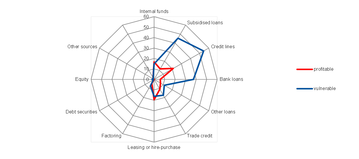 5. Vulnerable firms are defined as those firms that have reported simultaneously lower turnover, decreasing profits, higher interest expenses and a higher or unchanged debt-to-assets ratio, while profitable firms are those that report simultaneously higher turnover and profits, lower or no interest expenses and a lower or no debt-to-assets ratio. See the box entitled “Distressed and profitable firms: two new indicators on the financial position of enterprises”, Survey on the Access to Finance of Enterprises in the euro area, October 2017 to March 2018, ECB.