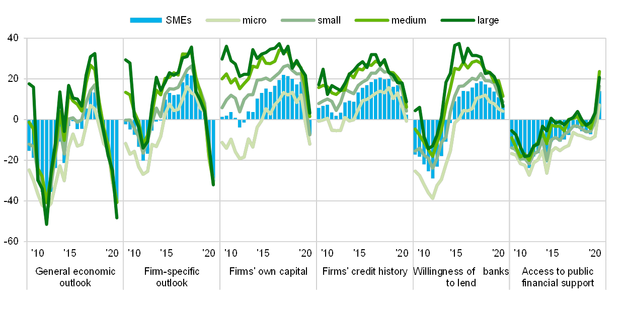 For the first time since 2009, euro area SMEs reported an improvement in access to public financial support (14%, from -3%), an indication that the initiatives by a number of governments to provide public guarantees for bank loans during the COVID-19 pandemic have fed through to these enterprises.