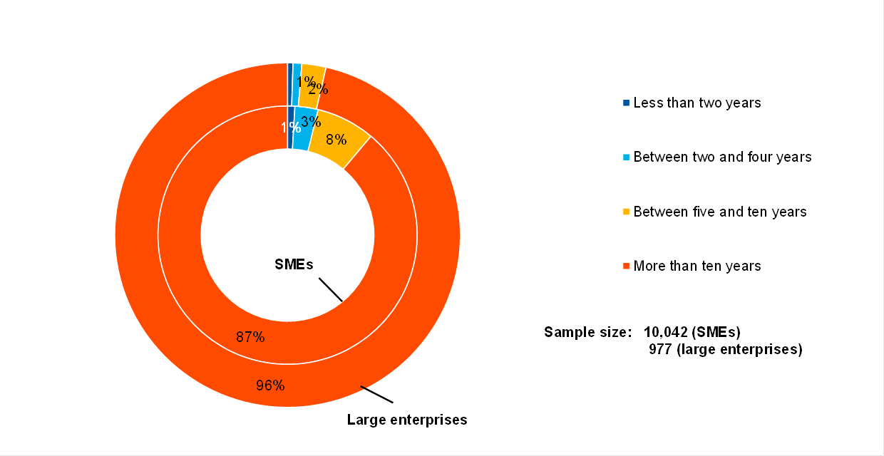 For the second year in a row, the survey also asked SMEs about the extent to which they perceived late payments[7] as a problem, and what impact late payments have on their business activity. In this survey round, 12% of euro area enterprises (both SMEs and large companies) signalled that they experienced problems on a regular basis as a result of late payments from private and/or public entities. Meanwhile, 31% of SMEs mentioned that these problems occurred occasionally in the last six months. These numbers imply just a marginal decrease for regular problems (13%) compared with last year’s replies and a decrease by the same percentage for occasional ones. The frequency of regular problems with late payments over the last six months is the same for SMEs as for large companies. However, the percentage of large firms experiencing occasional late payments has increased to 37% over the past six months (from 30% last year), which suggests that larger firms may have been more affected this year by disruptions resulting from the COVID-19 pandemic owing to their supposedly wider business networks.