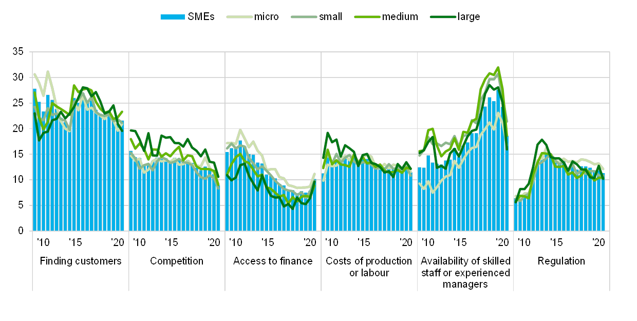 Finding customers became the dominant concern for euro area SMEs, overtaking availability of skilled labour in this survey round. Looking at a breakdown by firm size, micro, small and medium-sized euro area companies cited finding customers as their main concern, with percentages of 21% (from 20%), 21% (from 22%) and 23% (from 22%) respectively. The subdued economic activity as a result of the COVID-19 crisis has eased concerns about the availability of skilled workers among SMEs regardless of their size: on balance, only 17%, 21% and 19% of micro, small and medium-sized companies respectively reported being concerned in this survey round, compared with 21%, 26% and 28% respectively in the previous survey round. Moreover, large firms showed a similar easing in their concerns over finding skilled staff (16%, from 25%). Across firm sizes, the concerns regarding costs of production, regulation and competition eased slightly in this survey round. Meanwhile, concern over access to finance rose slightly, but this continues to be considered among the least important obstacles for euro area SMEs.