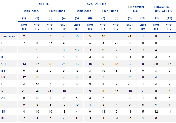 The external financing gap for SMEs – i.e. the difference between the change in demand for and the change in the availability of external financing – remained positive, both at the euro area level (4%, down from 5%) and across almost all euro area countries (see Table 1, column 10).