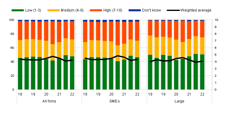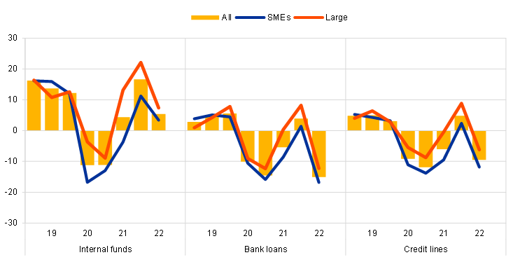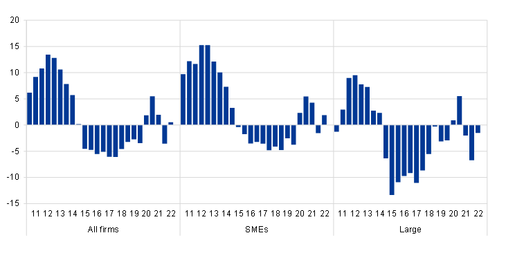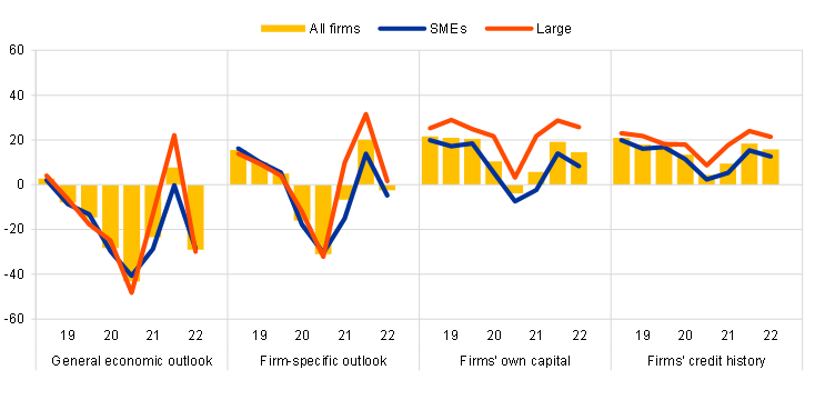 The balance sheets of euro area SMEs have continued to deteriorate over the last six months. The net percentage of SMEs indicating increases in their debt-to-assets ratios remained at 8%, reflecting the adverse economic environment seen since early 2020, which ended the protracted deleveraging trend observed since 2010. In net terms, the weakening of firms’ financial positions only affects SMEs, with large firms tending, on average, to report declines in their debt-to-asset ratios in this survey round.
