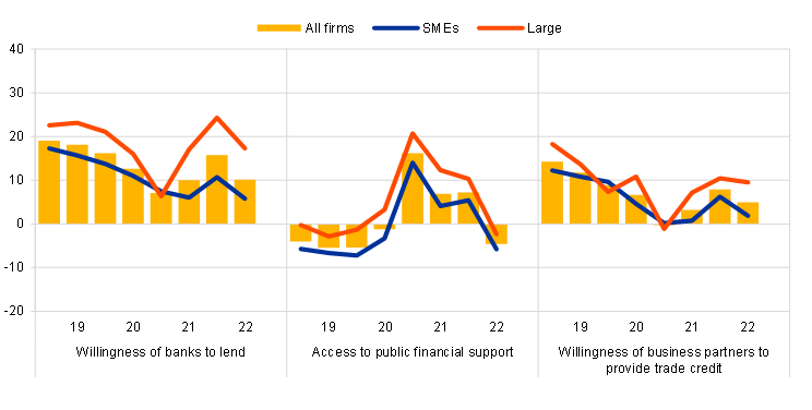 Looking ahead, SMEs continued to be concerned about their access to external financing, although less so than in the previous round. In particular, SMEs were concerned about future access to bank loans (-9%, up from -16%) and credit lines (-10%, up from -14%).