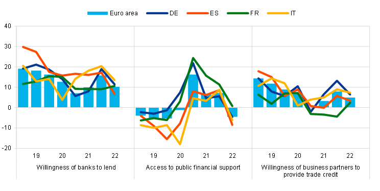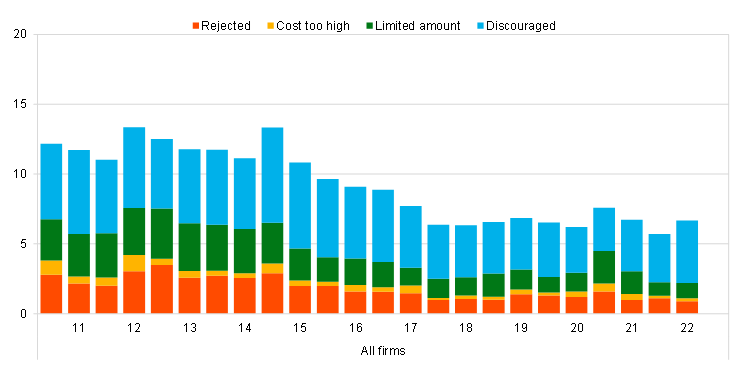 3. The financing obstacles indicator is the sum of the percentages of SMEs reporting the rejection of loan applications, loan applications for which only a limited amount was granted, and loan applications which resulted in an offer that was declined by the SME because the borrowing costs were too high, as well as the percentage of SMEs that did not apply for a loan for fear of rejection.
