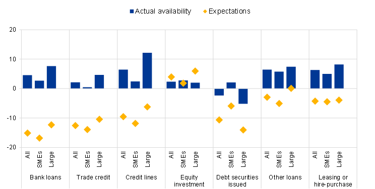 Larger enterprises tend to be more optimistic in their expectations for most sources of external financing. For example, large firms expect, in net terms, to see an improvement in their access to most sources of external finance in the months ahead, whereas SMEs expect a further deterioration.