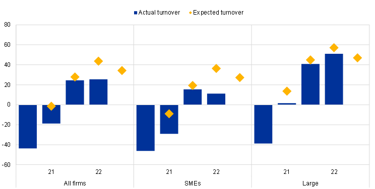 Consequently, a significant proportion of euro area SMEs continued to report a deterioration in profits, albeit less so than in the previous round (-35%, up from -47%). The deterioration in profits was broadly based across all firm sizes, but larger firms seem to be experiencing a stronger recovery on account of the somewhat faster rebound in turnover.