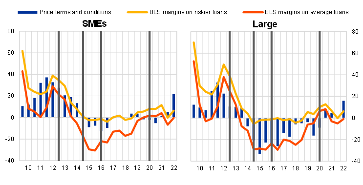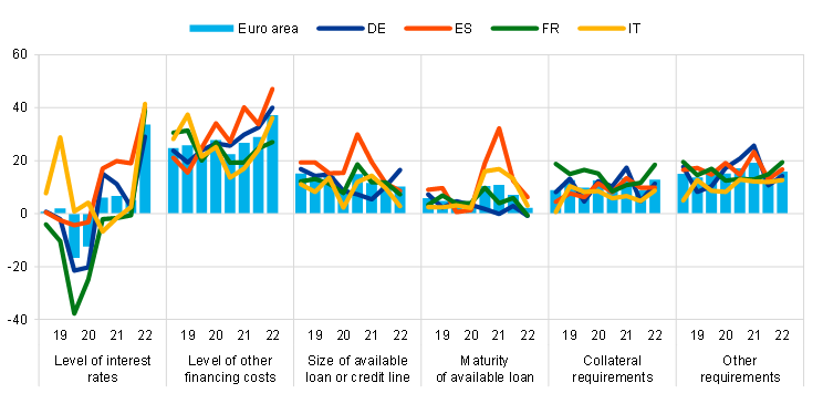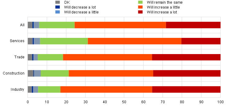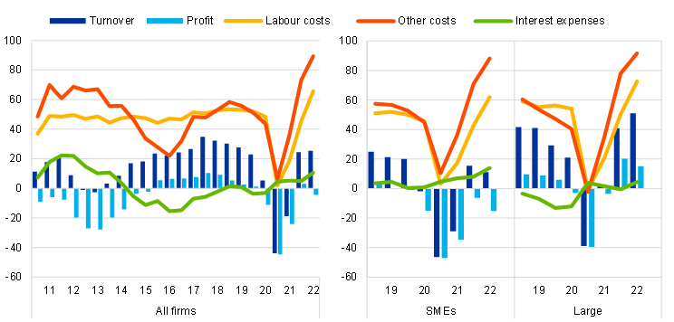 At the same time, euro area enterprises also reported increases in labour and other costs (i.e. for materials and energy). A larger net proportion of euro area SMEs reported increases in labour costs (17%, up from 3%) and other costs (36%, up from 11%), with increases being reported for all firm sizes. In contrast, while more SMEs reported increases in interest rate expenses, the percentage of larger firms reporting them declined marginally.