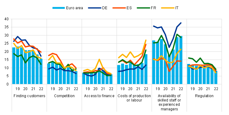 The main concerns among SMEs followed broadly similar patterns across euro area countries, albeit some cross-country heterogeneity remained (see Chart 8 and Chart 35 in Annex 1). Looking at the largest euro area countries, Spanish SMEs reported difficulty in finding customers as their main concern (25%, which was above the euro area average of 20%), but that was significantly less of a concern for French SMEs (16%). Meanwhile, the lack of skilled staff was the biggest concern for German SMEs (28%), but less of a problem for Spanish (12%) and Italian (13%) SMEs.