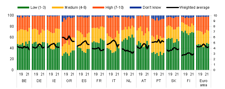 Notes: The formulation of the question has changed over the survey rounds. Initially, respondents were asked to select one of the categories as the most pressing problem. From round 8, all respondents were asked to indicate how pressing a specific problem was on a scale of 1 (not pressing) to 10 (extremely pressing). In round 7, the question used the initial phrasing for one half of the sample and the new phrasing for the other half. In addition, if two or more items had the highest score in question Q0B on how pressing the problems were, a follow-up question (Q0C) was asked in order to resolve this, i.e. determine which of the problems was more pressing, even if only by a small margin. This follow-up question was removed from the questionnaire in round 11. The past results from round 7 onwards were also recalculated, disregarding the replies to question Q0C. In round 12, the word “pressing” was replaced by the word “important”.
