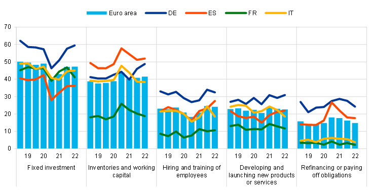 In this survey round, euro area SMEs reported, in net terms, moderate increases in demand for bank loans and credit lines. A net 12% of SMEs reported higher demand for bank loans (down from 20%), and a net 10% reported increased demand for credit lines (down from 16%) (see Table 1, columns 2 and 4). External and internal financing continued to be used primarily for fixed investment, inventories and working capital, but 16% of SMEs also used it for refinancing or paying off obligations.